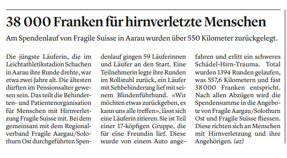 - 09.2023 Aarauer Nachrichten: Der erste FRAGILE Spendenlauf war ein voller Erfolg!