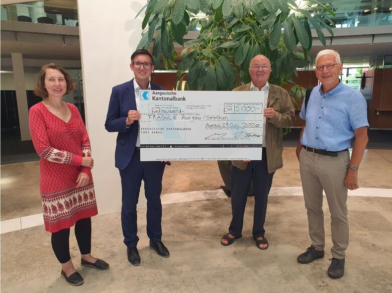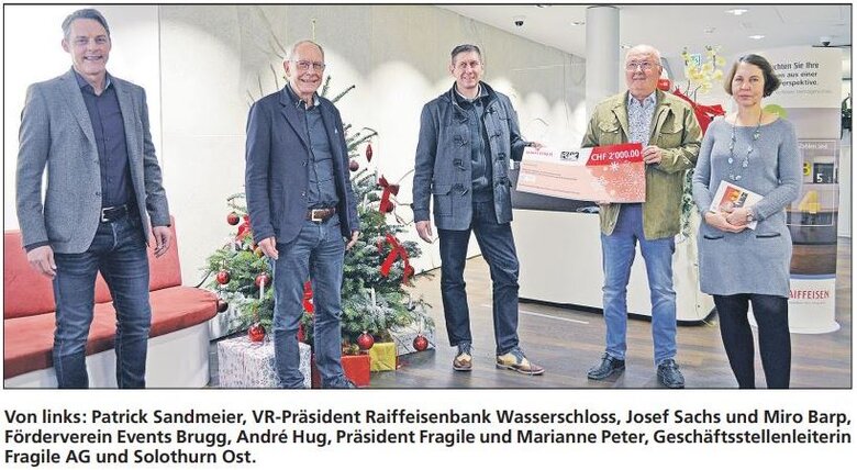 Die Raiffeisenbank Wasserschloss übergibt 2000 Franken an den Förderverein Events Brugg und dieser unterstützt damit den Verein Fragile Aargau und Solothurn Ost