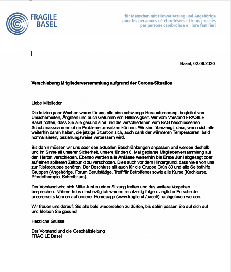 Der Vorstand von FRAGILE Basel hat beschlossen alle Anlässe weiterhin bis Ende Mai abzusagen oder auf einen späteren Zeitpunkt zu verschieben.