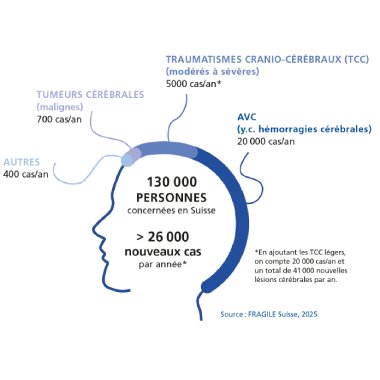 En Suisse, on recense chaque année environ 26 000 nouvelles lésions cérébrales. Si l'on ajoute à ce chiffre les traumatismes cranio-cérébraux légers tels que les commotions cérébrales, on arrive à un total de 41 000 lésions cérébrales par an. Ensemble, elles engendrent environ 200 millions de francs de coûts directs.