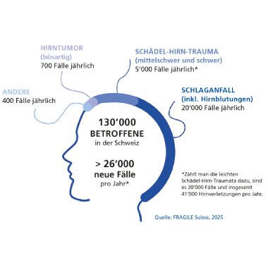 In der Schweiz gibt es jährlich etwa 26’000 neue Hirnverletzungen. Zählen wir die leichten Schädel-Hirn-Traumata wie Hirnerschütterung dazu, sind es insgesamt 41'000 Hirnverletzungen pro Jahr. Zusammen verursachen sie ca. 200 Mio. Franken direkte Kosten.