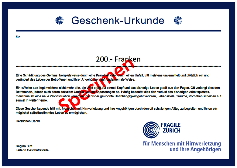 Spenden Sie FRAGILE Zürich im Namen einer beschenkten Person einen frei wählbaren Geldbetrag. Damit fördern Sie ein nachhaltiges Projekt zugunsten von Menschen mit einer Hirnverletzung. Herzlichen Dank!